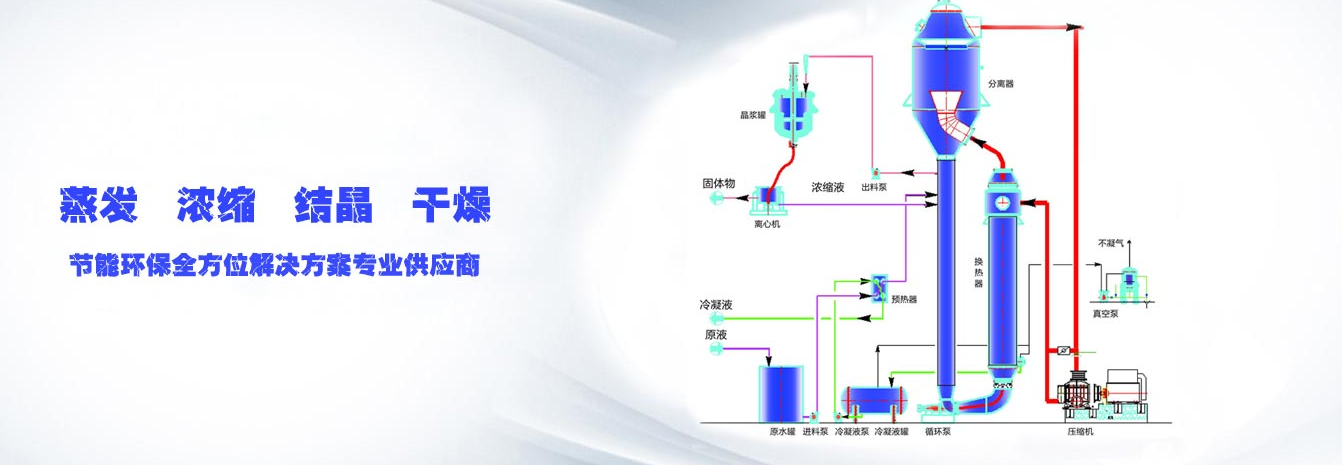 公司生产制造的MVR蒸发器,是传统多效蒸发器和反应釜的理想替代产品。MVR蒸发器是集高效节能、自动化为一体的科技型产品,其节能效果相当于传统多效蒸发器的30效。MVR蒸发器广泛应用在果糖浓缩、中药提纯、化工废水脱盐、海水淡化、垃圾液处理、切削乳化液处理等领域。结合我公司工业废水处理的其他综合技术,例如高盐生化、物化混凝、MBR技术、氧化芬顿、闪蒸精馏、活性炭吸附再生等,有效的使MVR蒸发技术发挥到优化状态。
